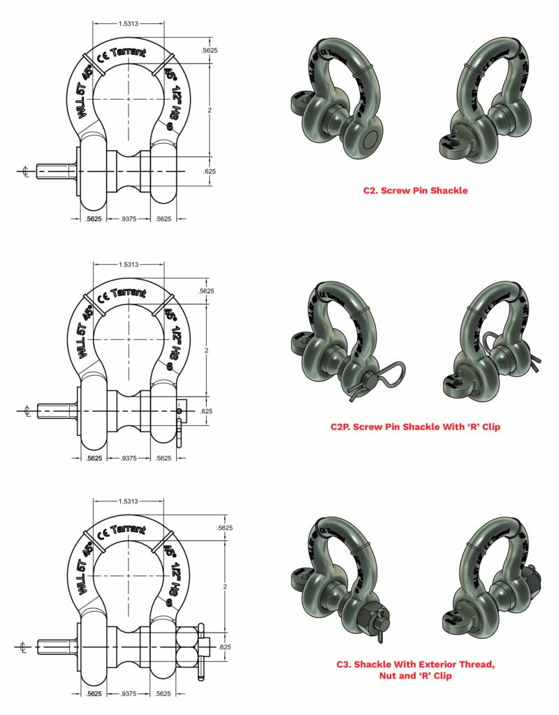 The third model is a screw pin shackle with the added safety feature of a cotter pin, or an “R” clip attached to the end of the pin (C2P)